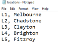 • This class has another method named read_locations. This method takes in a file name and can read and add the locations stored in that file to the location list of the class. In the sequel, we call this the location file. See an example of the location file below.