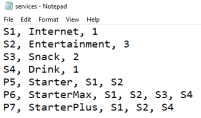 In this file, the services are always in this format: ID, name, and the price of the service. On the other hand, the data of a package consists of all the component services of the package. For example, the package StarterMax consists of the services S1, S2, S3, and S4. The ID of service always starts with the letter “S” whilst the ID of a package always starts with the letter “P“. The IDs/ names of the services and packages are all unique. The data format of a package is different compared to a service. You can assume all the component services in a package are unique (no duplicates) and existing services. You can assume packages are always stored at the end of a file, after all normal services. You can again assume there are no errors in the file services.txt.