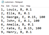 In this file, the customers are always in this format: customer_ID, customer_name, customer type, discount_rate (first discount rate for Enterprise customers), and threshold (if that is an Enterprise customer). For example, in the 1st line, the customer_ID is 1, the name is Louis, the customer type is B (Basic customer), and the discount rate is 10%. In the 3rd line, the customer_ID is 3, the name is George, the customer type is E (Enterprise customer), the discount is 15% (the first discount rate), and the threshold is