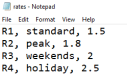 In this file, the data are always in this format: rate_ID, rate_name, price_per_km. The rate ID always starts with the letter “R“. The IDs and the names are all unique. You can assume there will be no error in this file (e.g., the data format is always correct, and the prices are always valid).